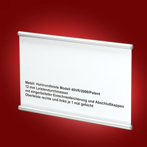 maximale Leistenlänge: 1100 mm Leistendurchmesser: 12 mm Leistenfarbe: bis 1000 mm - nach Farbkarte PAS-STANDARD bis 1100 mm – PAS-schwarz oder PAS-weiß oder PAS-alu oder PAS-sterlingsilber Papierfleischanspruch: oben und unten je 12 mm, maximal 9 mm Weißrand, 3 mm als Farbüberfüllung Aufhängung: Oberleiste mit: Dreieckaufhänger/Kunststoff/weiß oder schwarz oder alufarben – Lochabstand 200 und 400 mm links und rechts je 1 mal gelocht mögliches Aufhängezubehör: Metall- Deko- Haken mit 1500 mm Perlonfaden und Splint Spiralhaken – ausziehbar Feinseil- Dreieckaufhänger, Lochabstand 800 mm höhenverstellbare Feinseilaufhänger mögliches Zubehör. mit Innen- Abschlusskappen schwarz oder weiß oder alufarben Verpackung: einzeln rollen und banderolieren einzeln rollen und in Polyschlauch einschweißen, satzweise in Polyschlauch einschweißen, einzeln oder satzweise in Versandhülsen einzeln oder satzweise in Wellpapp-4- kant- Verpackung einzeln oder satzweise in Wellpappkartons Prospekte oder sonstiges Werbematerial beifügen Einzelsendungen mit Paketdienst oder Spedition versenden |