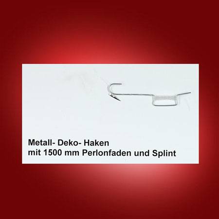 Perlonfadenstärke: 0,4 mm Länge: 1500 mm 1 Satz: 1 Satz = 2 Stück Ausführung: Metall- Dekohaken mit 1500 mm aufgespulten Perlonfaden und angeknüpften Splint Verpackung: satzweise in Polygrippbeutel