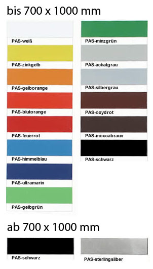 maximales Rahmenformat: 1000 mm x 1400 mm Rahmenleisten- Durchmesser: 20 mm Farben der Rahmenleisten: bis Format 700 x 1000 mm = nach Farbkarte PAS-STANDARD ab Format 700 x 1000 mm = PAS-sterlingsilber und PAS-schwarr Farben der Clipecken: schwarz oder weiß oder alufarben Sonderfarben: silber oder goldfarben Papierfleischanspruch: 4-seitig je 19 mm, maximal 10 mm Weißrand und 9 mm Farbüberfüllung Aufhängung: Oberleiste mit Dreieckaufhänger/Kunststoff/ weiß oder schwarz oder alufarben, Lochabstand 200 und 400 mm Oberleiste links und rechts je 1 mal gelocht Aufhängung bei eingearbeiteter Rückwand: 2 eingearbeitete Aluaufhänger in der Rückwand 2 ausgestanzte Aufhänger in der Rückwand mögliches Aufhängezubehör: Feinseil- Dreieckaufhänger, Lochabstand 200, 400, 600 mm höhenverstellbare Feinseilaufhänger Verpackung bei teilmontierten Rahmungen: planliegend in Containers die seitlichen Rahmenleisten und Clipecken extra gepackt Verpackung bei Rahmung mit Rückwand: einzeln in Wellpapp- Kreuzverpackung planliegend in Containers Unser System erhalten Sie teilmontiert ohne Rückwand o d e r komplett montiert mit eingearbeiteter Rückwand o d e r komplett montiert mit eingearbeiteter Rückwand und mit eingearbeitetem Kunstglas |